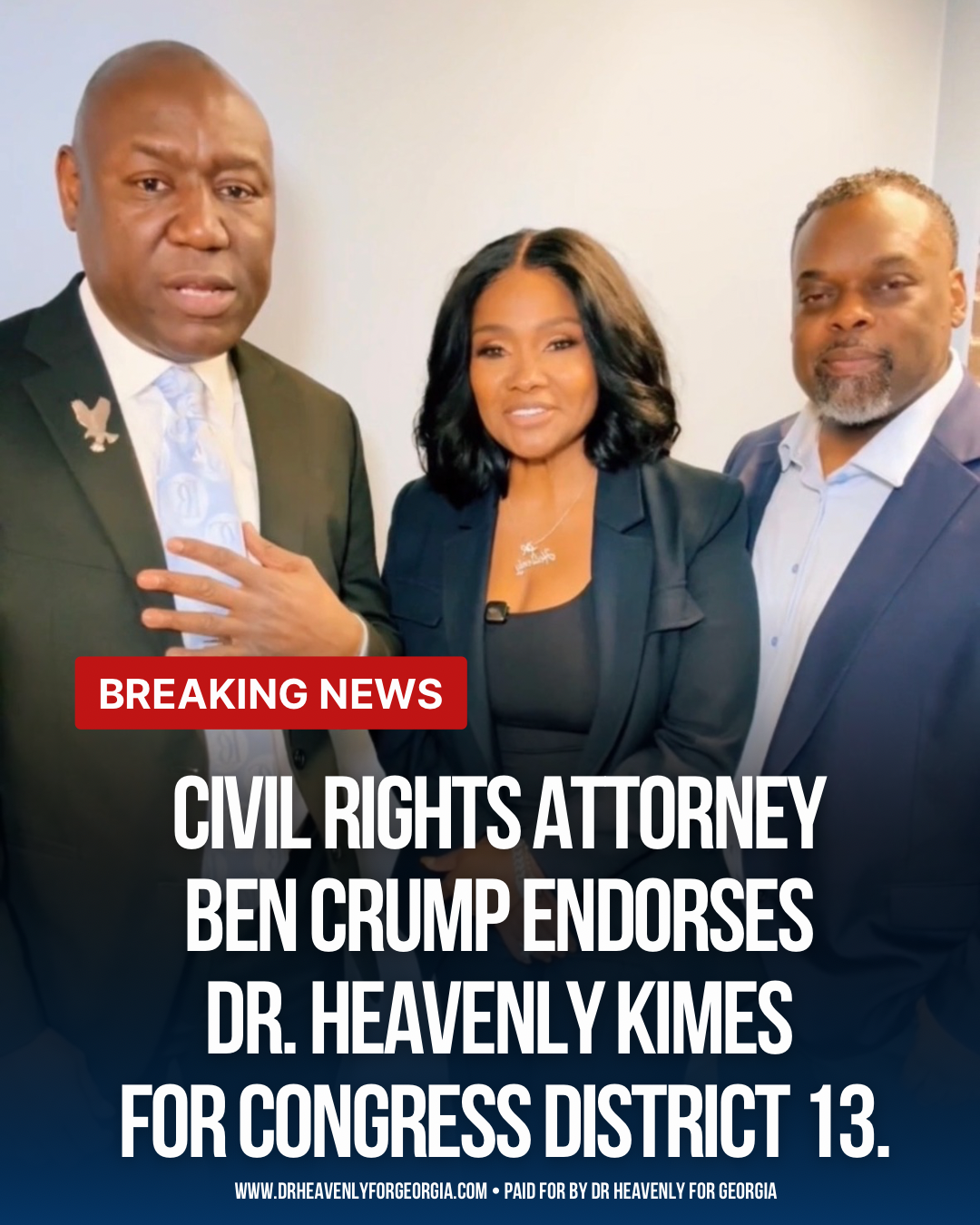 ATLANTA, GA, UNITED STATES, April 27, 2026 /EINPresswire.com/ — Dr. Heavenly Kimes, candidate for Congress in Georgia’s 13th District, confirmed the endorsement of nationally recognized civil rights attorney Ben Crump, adding to a growing coalition of community leaders, elected officials, and advocates supporting her campaign. See the full video: https://www.instagram.com/p/DXh4sAygT-p/
